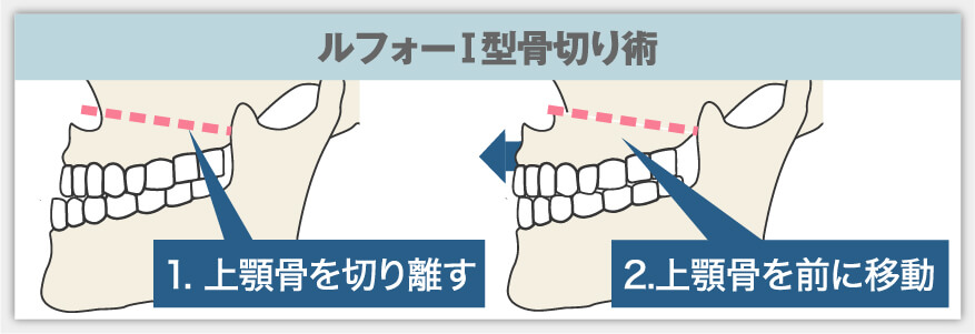 ルフォーⅠ型骨切り術は、鼻の下で上顎骨を分離し、上顎骨を一塊として動かす手術で、下顎前突症の治療に使う場合は、前方に移動させて、チタン製のミニプレートなどで固定します。