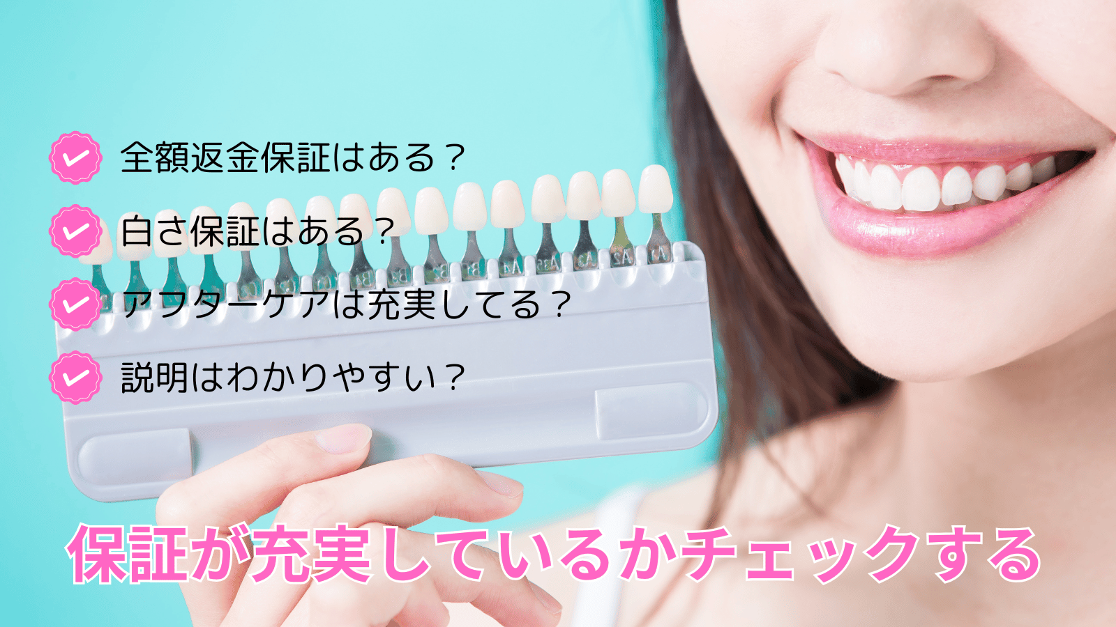 万一思ったような白さにならなかった場合に返金される「全額返金保証」や、一定の白さになるまで無料で何度でも施術が受けられる「白さ追求保証」など、クリニックによってはこうした保証が用意されています。