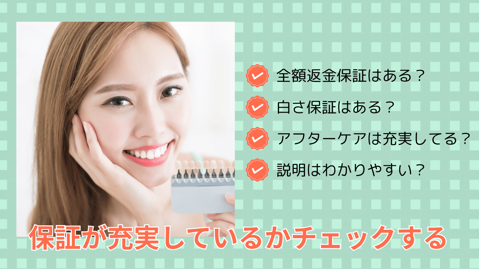 たとえば、万一白さに満足できない場合は全額返金される「全額返金保証」や、一定の白さになるまでは無料で再施術が受けられる「白さ保証」などがあります。