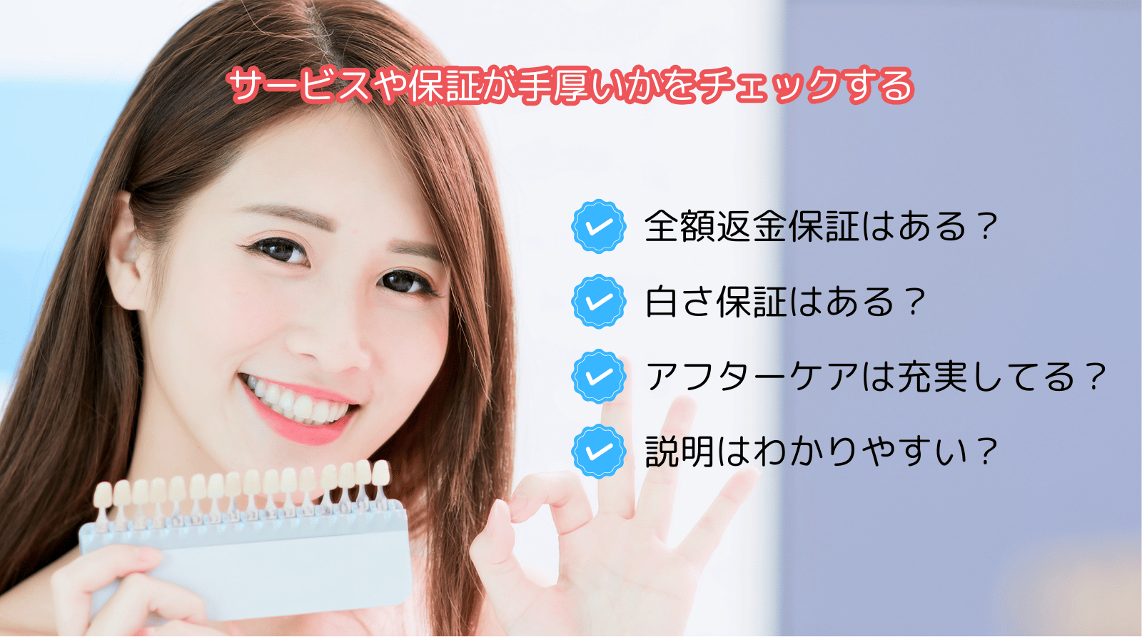 ホワイトニングの効果は個人差があります。そのため、自分の希望していた歯の白さにならなかった場合に、全額返金保証や白さ保証があるクリニックならお財布の負担を減らせるでしょう。